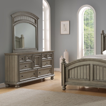 New England style with wainscoting, turned bun feet, and turned finials Unfussy, classic design in a new neutral: khaki grey.