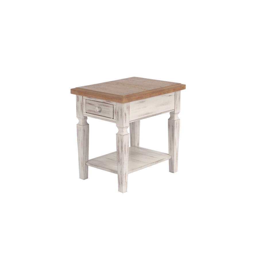 Two toned solid hardwood in burlap andd heavily distressed white.