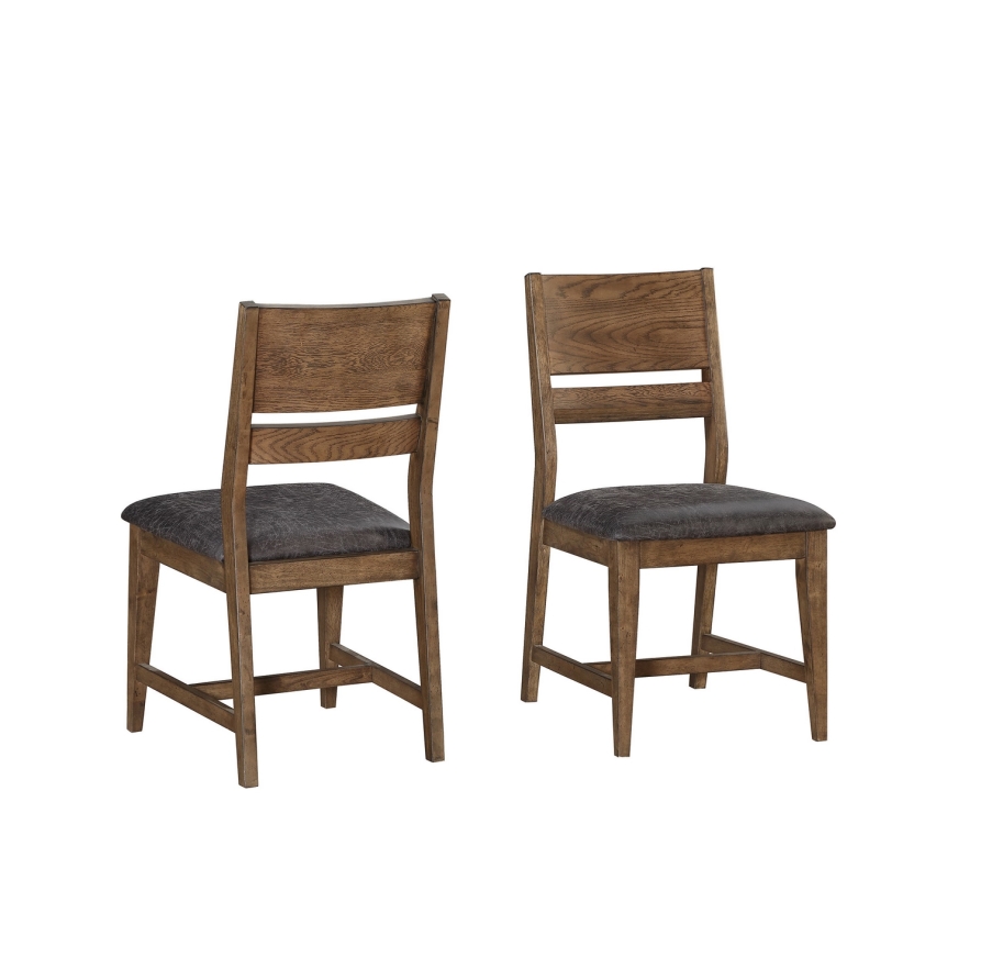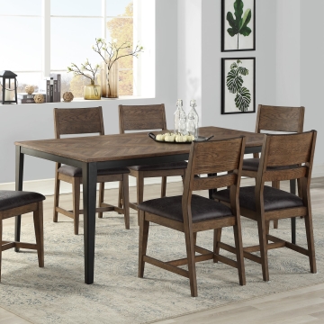 Chic acacia veneer in a rustic herringbone pattern sits atop a sturdy metal frame and legs. Two chair styles create completely different looks.