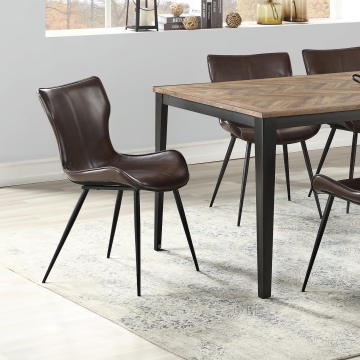 Chic acacia veneer in a rustic herringbone pattern sits atop a sturdy metal frame and legs. Two chair styles create completely different looks.