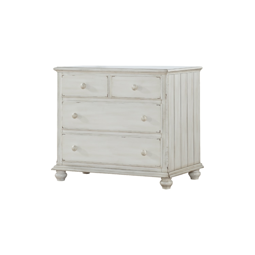 Heavily distressed pine veneer, pine solids, and engineered wood in an antique white finish, and equally at home with farmhouse or coastal styles.