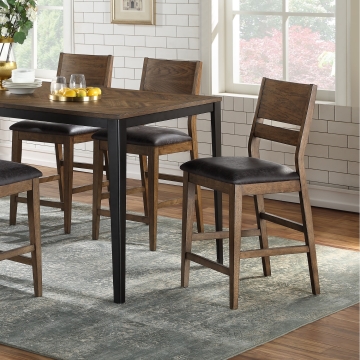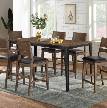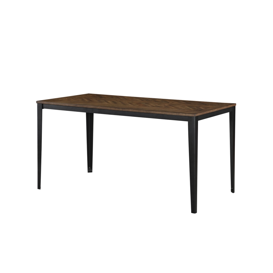 Chic acacia veneer in a rustic herringbone pattern sits atop a sturdy metal frame and legs. Two chair styles create completely different looks.