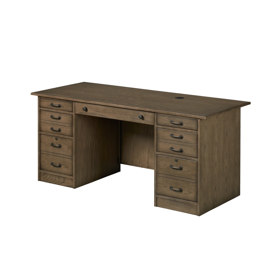 Industrial brown oak veneer, oak solids, and engineered wood with antique-style hammered hardware. This collection offers pieces for every size office, from a 42" writing desk to a 64" return desk, with files and storage to match.