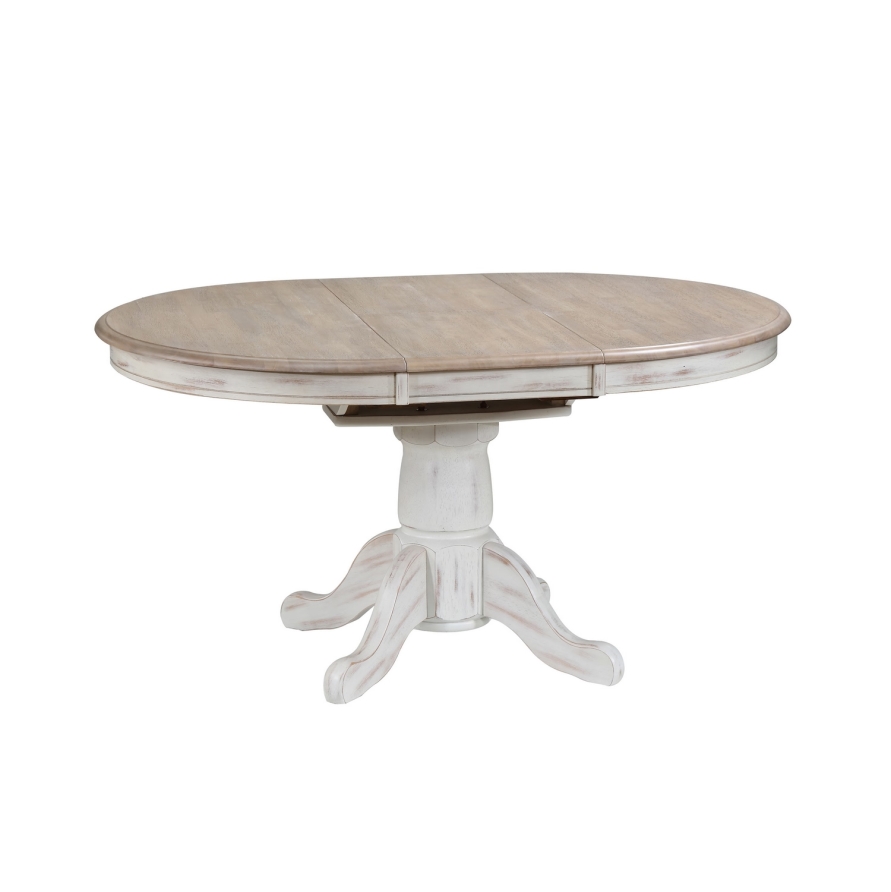 - Self-storing 15" butterfly leaf extends table from 42" round to 42" x 57" in oval
