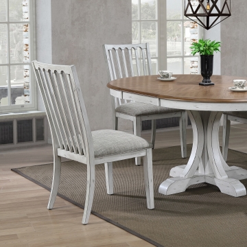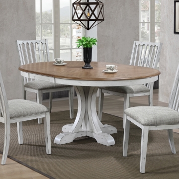 Two-tone vintage style in Brown oak veneer and Antique White solid hardwood. Seating for 8 at the 96 in pedestal table or cozy seating for 6 at the 66 in pedestal table. Cushioned chairs and solid wood bench seating.