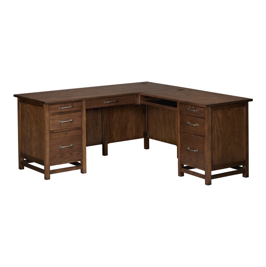 Rich, dark brown oak veneer, oak solids, and engineered wood with antique-style hammered hardware for an enduring, timeless home office look. Constructed to handle even heavy commercial use, these heirloom quality pieces are built to last.