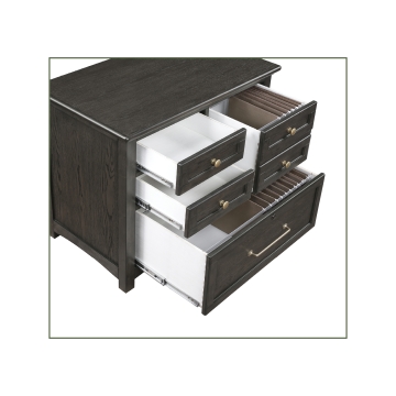Oak veneer and solid hardwood in traditionally-inspired charcoal finished home office. Delicate curves lend softness to this unfussy design, with all of the features Winners Only home office is known for.