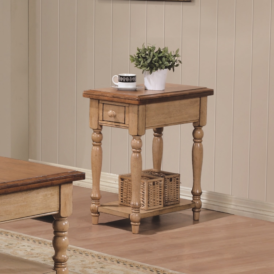 Four tables with thick tops, heavy, turned legs, and ruggedly-built drawers. These tables are built to last.